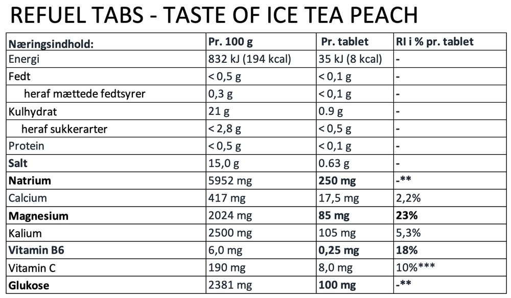 Ingredienser: Syre (citronsyre, natriumhydrogencarbonat), fyldemiddel (sorbitol), aroma (fersken, te), magnesiumcarbonat, kaliumchlorid, dextrose, rødbedejuicepulver, farvestof (sulfit-ammoniak-karamel), calciumcarbonat, majsstivelse, sødestof (sucralose), L-ascorbinsyre (vitamin C), farvestof (riboflavin), maltodextrin, pyridoxinhydrochlorid (vitamin B6).