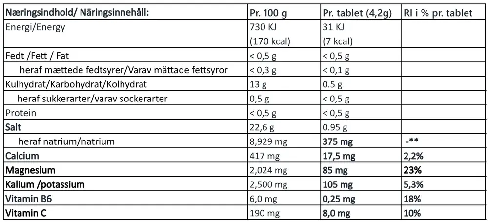 magnesiumcarbonat, fyldemiddel (sorbitol), kaliumchlorid, aromaer, majsstivelse, calciumcarbonat, sødestof (sucralose), rødbedejuicepulver, vitamin C (L-ascorbinsyre), maltodextrin, vitamin B6 (pyridoxinhydrochlorid).